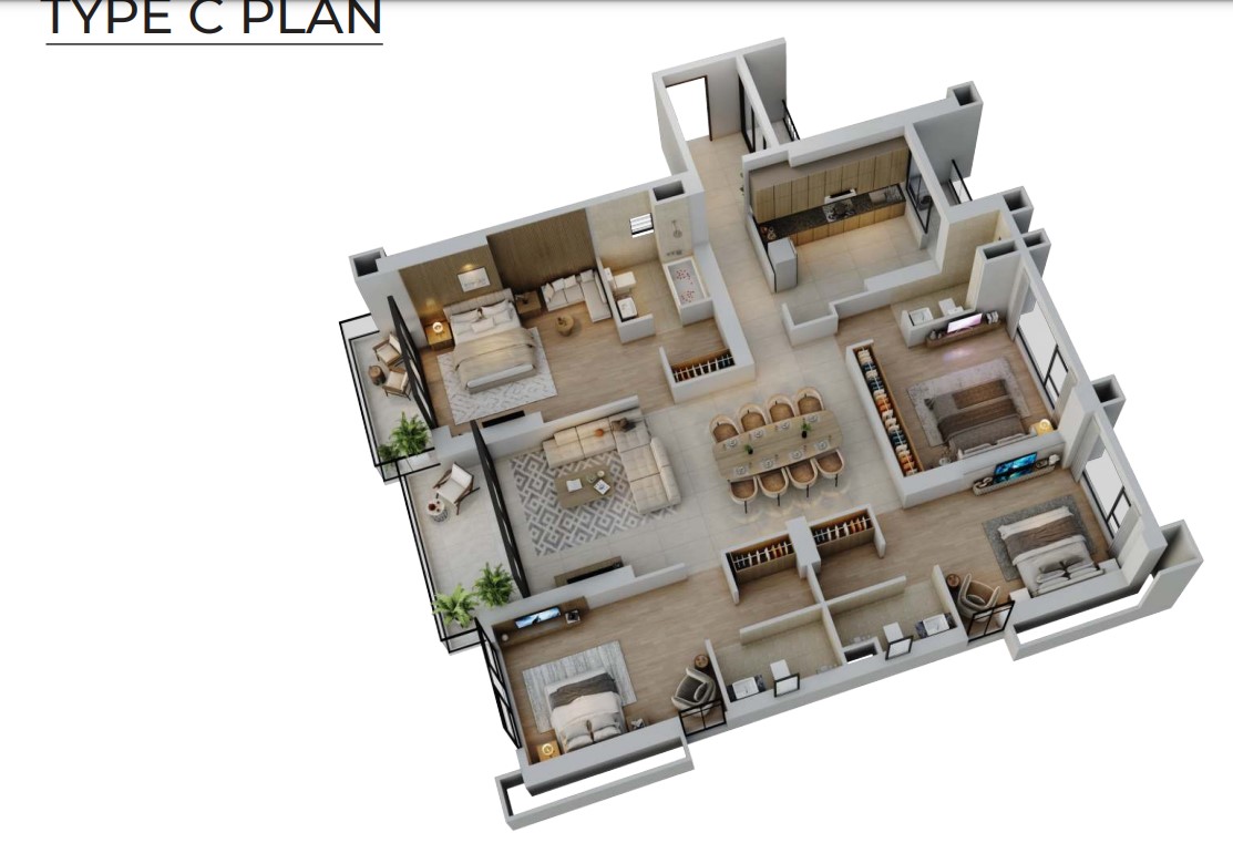 Craftsmanship and Space: 4 BHK simplex (3350-3380 sq.ft.) and 4.5 BHK duplex (4965 sq.ft.) residences tailored for elegance.